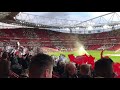 football score Arsenal fans make a good atmosphere ahead of their europa league game v atletico madrid with flags | |